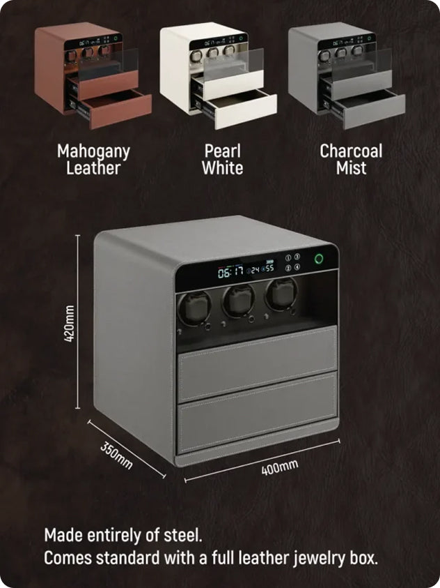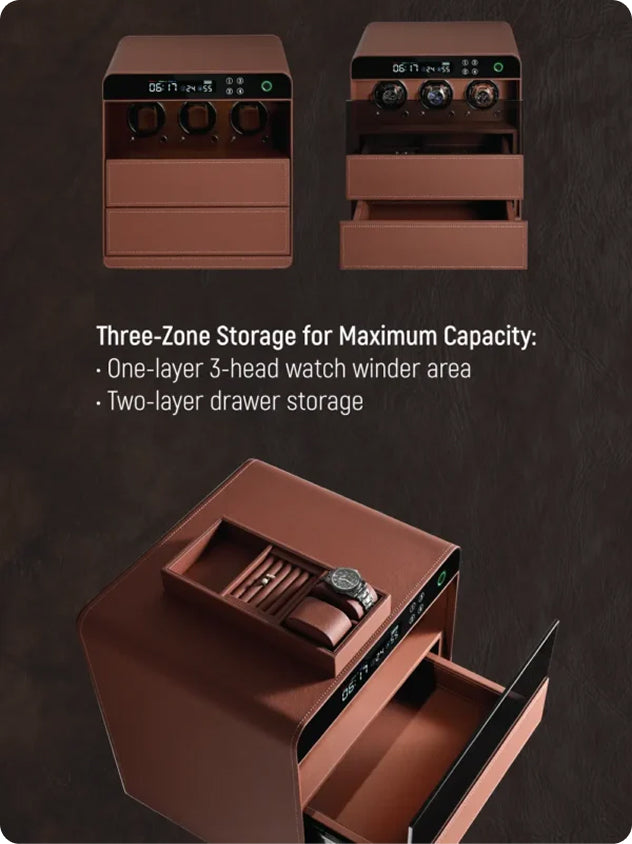 - Three-zone storage: a 3-head watch winder and two storage drawers.