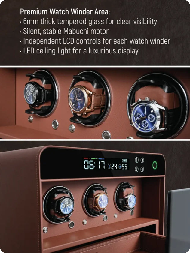 - Premium Watch Winder Area: 6mm tempered glass, a silent Mabuchi motor, independent LCD controls, and LED lighting.