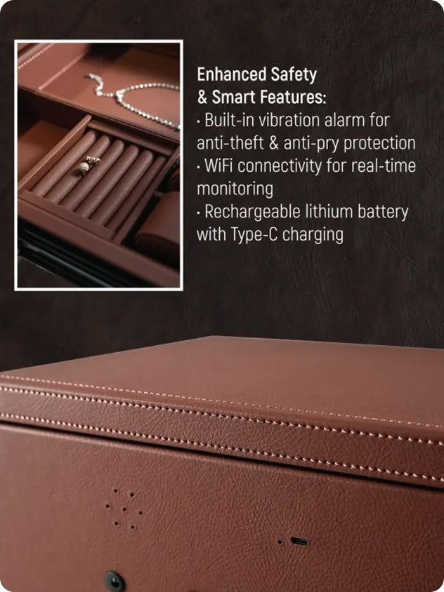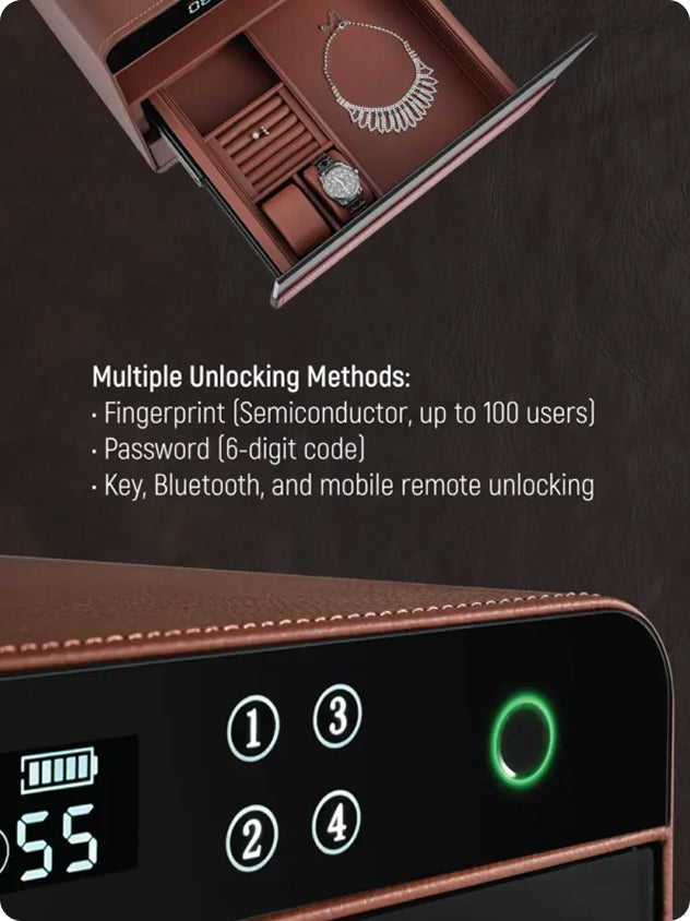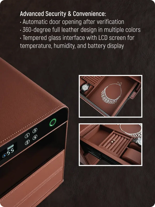 - Advanced security with auto door opening, a 360-degree full leather design in multiple colors, and an LCD glass interface for temperature, humidity, and battery display.